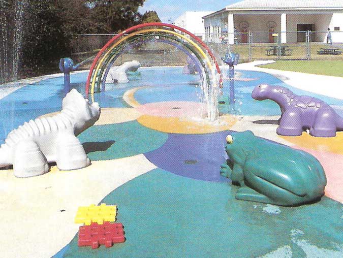 It's no wonder. With four spraying dinosaurs, two spraying frogs, two spraying elephant heads on elevated poles all surrounding a 4-tier, arching, red, yellow, green and blue rainbow that sprays a mist of heavy dew down on those who play under it, even the school and camp instructors are tempted to get wet. The design is spread out over 2,500 square feet and is set in a colorful and well-designed pour-in-place soft rubber safety surface with hues of yellow, green, pink and blue.