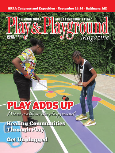 This issue of Play and Playground Magazine explores several non-traditional benefits of playgrounds. The Trust for Public Lands and Urban Math Trails have partnered to expand outdoor educational opportunities. The Cunningham Recreation program “Healing Communities Through Play” seeks to bring residents and law enforcement officers together to build playgrounds in cities that have been damaged by broken trust. A Master’s student performing an internship with Let’s Play America tells us how play benefits the whole community.