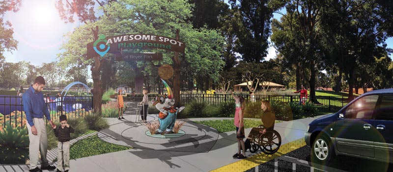 The Awesome Spot Playground (TASP) team in conjunction with The City of Modesto, CA is an “awesome” example of how this model works. The mission of the TASP team is to address inequality of access to recreation and play in their region through the development, maintenance, and programming of a socially inclusive and sensory integrated play space designed specifically to break down barriers that inhibit children, siblings, adults, and grandparents from participating in play with each other. Individuals typically left on the play sidelines due to barriers include: persons with disabilities, individuals on the autism spectrum, and those with moderate to severe sensory processing disorder (well over 10% of the population in California). For the past year and a half, this small group of grassroots community advocates (started by Rachel Loredo, a mother of a child with physical disabilities), which includes local design professionals, a Clinical Director with the Central Valley Autism Project, and City staff, have been working tirelessly to create a vision for the Awesome Spot Playground. The team is comprised of professionals that are directly involved with the disability industry and recreation systems, and therefore are intimately familiar with the ever-changing needs of families and maintenance needs of the facility.