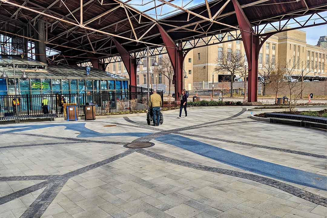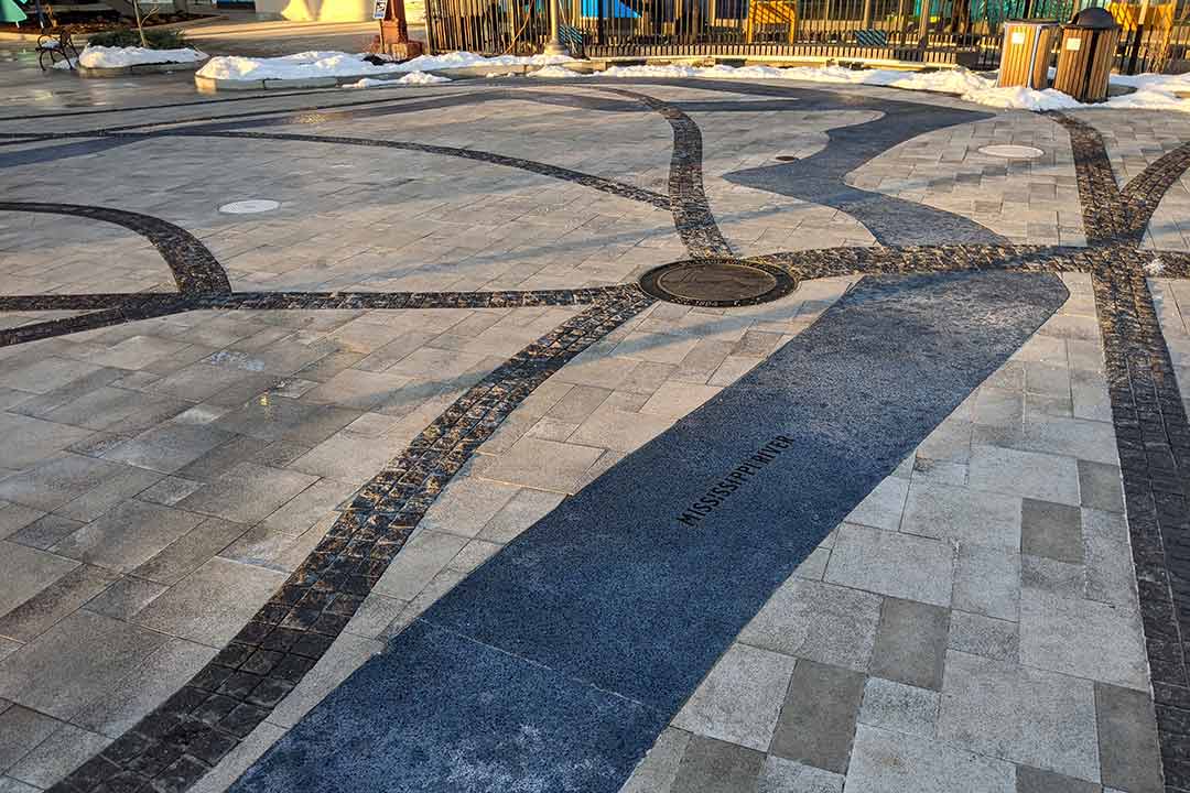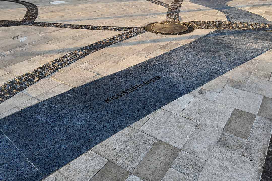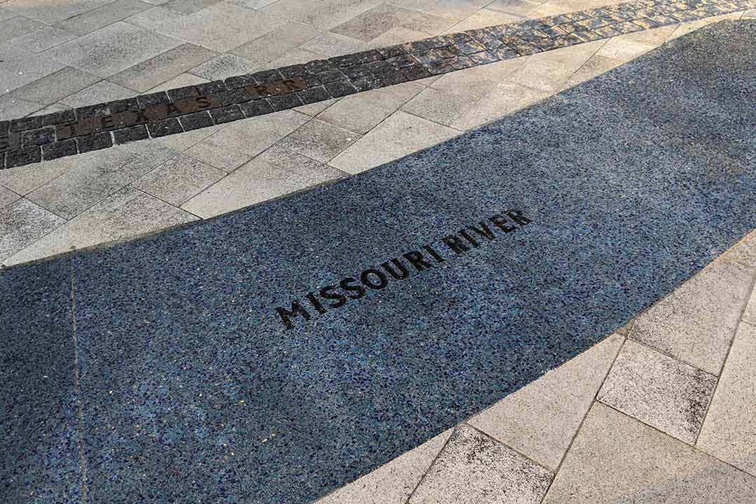 “The goal at Union Station was to create an artistic representation of the Missouri and Mississippi rivers within the concrete of the main entrance plaza,” says Kroesen. The design objective was to depict the flow of each river’s route through the land in concrete intermingled with rough-hewed stone pavers reflecting the patterns of rail lines radiating from Union Station. “Originally, the owner had an epoxy terrazzo surface in mind, but terrazzo does not do well outside. Bomanite Revealed allowed us to produce bright, bold blues in three integral colors with the names of the rivers rendered in a black relief in a way that stands out.”