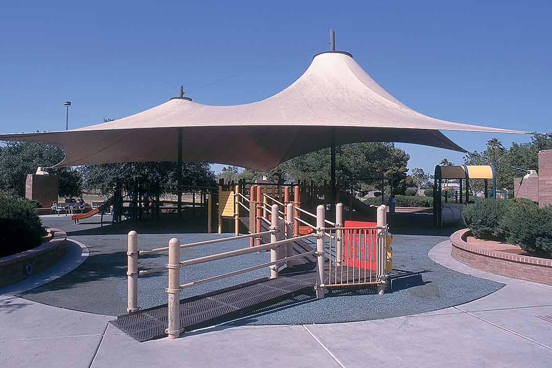 Another danger to children can be intense sun exposure. The Skin Cancer Foundation tells us that one blistering sunburn in childhood may double a person's chances of developing melanoma later in life. While it would be great if trees could shade every playground, confined urban areas don't always have room for trees. This is why fabric structures provide such an excellent alternative, protecting young skin from direct ultra-violet rays while shading equipment enough so that it doesn't become too hot to the touch. The other great benefit of fabric structures is that they add color, texture, and numerous possibilities for the designer's imagination.