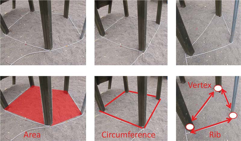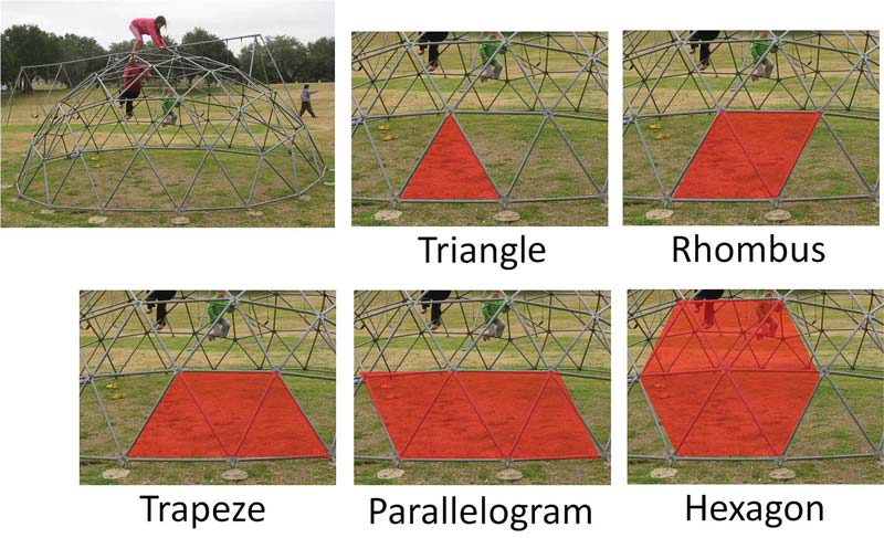 Most of the towers in the playgrounds are built of four columns. You can move the rope around the four columns and create a square. The geometric shape is the one that is enclosed within the rope.