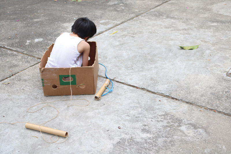 In that little area, hundreds of people played. They built houses and cut windows to peer through at their neighbors, and when they grew bored with that, they connected the houses together in one long tunnel. Children positioned themselves at different points: one handed out tickets which another took, and an older child poked his head in through a window in the middle "to make sure they’re all doing ok." Towers rose and fell, tipped over slowly by children giggling hysterically. They cut fabric into superhero capes and saved the bystanders. They dribbled pebbles through long cardboard tubes and discovered that acorns rolled into a wok make a sound like miniature thunder.