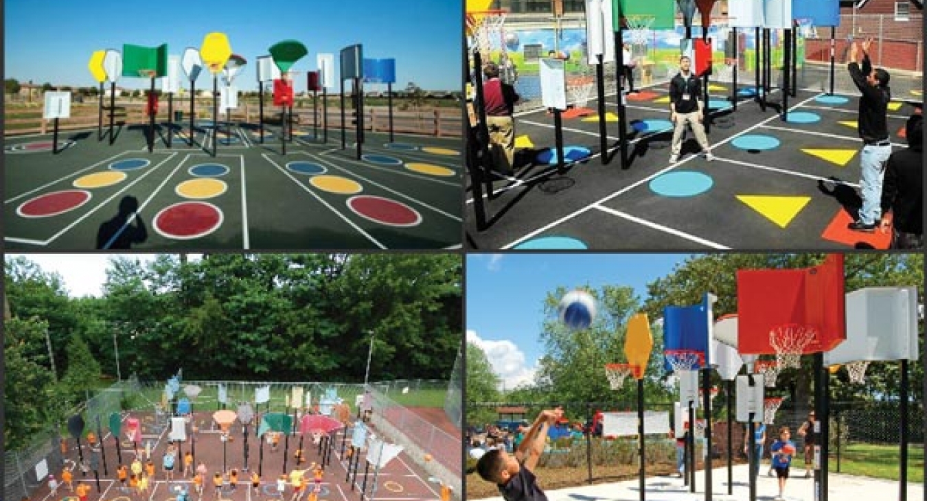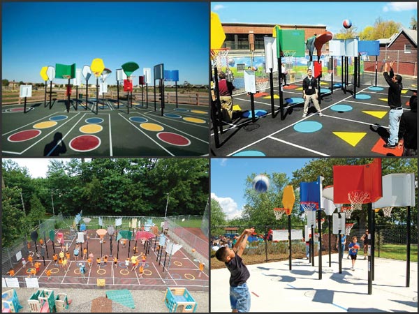 Playfields, usually ballplaying, are also well established in the panoply of facilities offered by a community: basketball, tennis, football, soccer, for which budgets, space, and attention are allocated, many would say disproportionately. These are in large part ballplaying sports that are opponent-competitive rather than self-competitive. Often body banging! It is a good thing that football players’ injuries are being reevaluated, and sports without brutal contact and sports based on self competition such as golf, bowling, and Bankshot are being advanced in some quarters. The latter including Bankshot Basketball, Bankshot Tennis, and Bankshot Soccer were introduced precisely as self-competitive sports – sports without opponents – that enable mobility-impaired and individuals with developmental disabilities to participate at any given moment in a drop-in, walk-on facility accessible and inclusive for all members of a family.