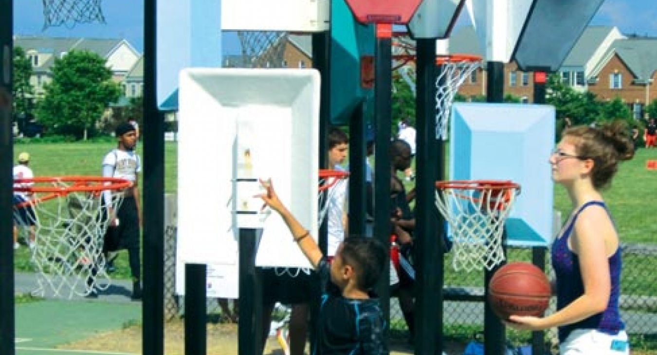 The young lad caught up with the young woman at one of the more difficult stations and the photograph shows the young lad pointing to where on the backboard must the ball strike according to the required physics so that the difficult shot might have a chance.