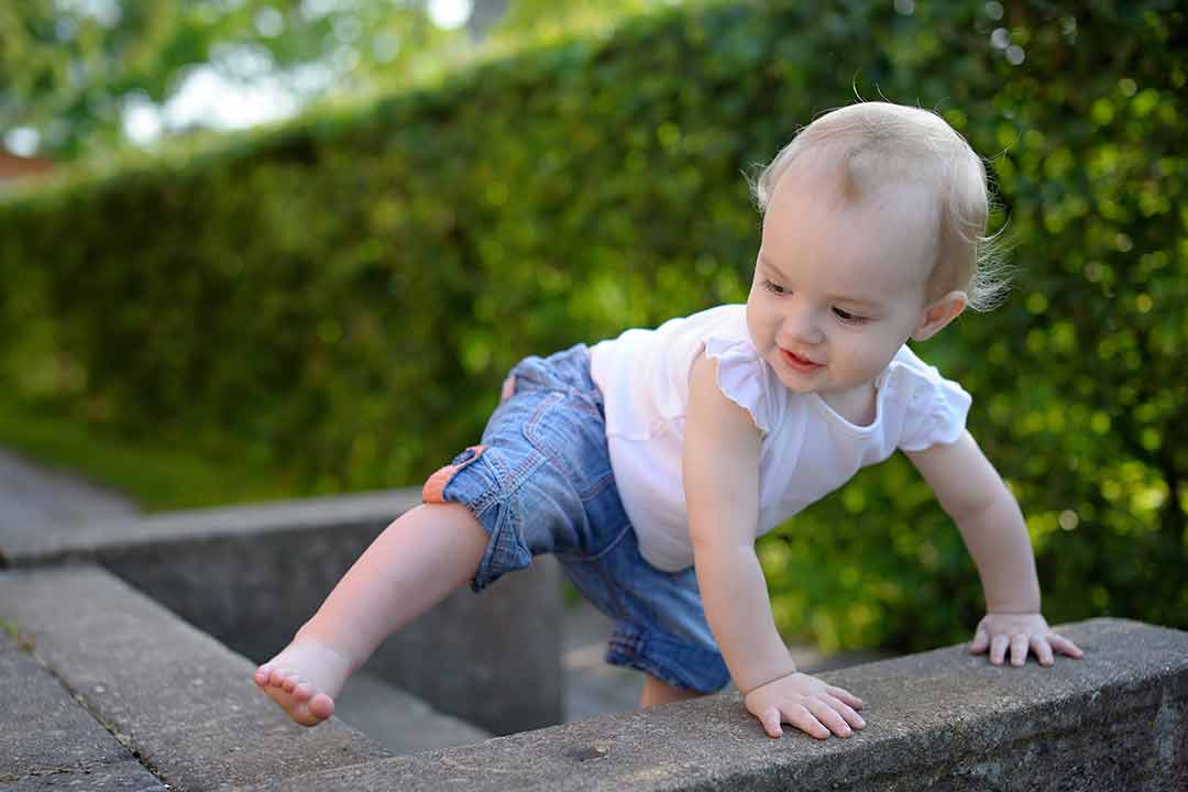 Babies crawl and explore every object in reach. Toddlers learn to walk and “cruise” haltingly and discover toys, furniture, and climbable objects. They investigate every accessible object and search for new sensations, sources of pleasure, and satisfaction of curiosity. Early climbing behavior follows predictable developmental processes – reaching, touching, rolling, pulling up, balancing, sitting, crawling, holding on, standing with support, and eventually grasping, stepping up and pulling to higher levels, walking, and running. This is natural and developmentally appropriate — with safety caveats. During early stages, the play environment should be carefully assessed for toddler safety and carefully monitored by adults. Unsafe objects are removed or secured from climbing and falling, and reasonably safe play materials are added – both indoors and outdoors. As children gain experience and development, monitoring is relaxed and new challenges are introduced. Risk is valued but minimized and carefully monitored as infants, toddlers, and pre-school children develop basic, rudimentary climbing skills.