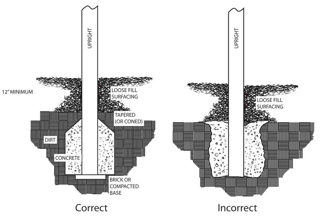 Concrete footings for playground equipment are one of the most important issues when constructing play equipment. The United States Consumer Safety Commission’s Handbook for Public Playground Safety notes, “When properly installed as directed by the manufacturer’s instructions and specifications, equipment should withstand the maximum anticipated forces generated by active use which might cause it to overturn, tip, slide, or move in any way."