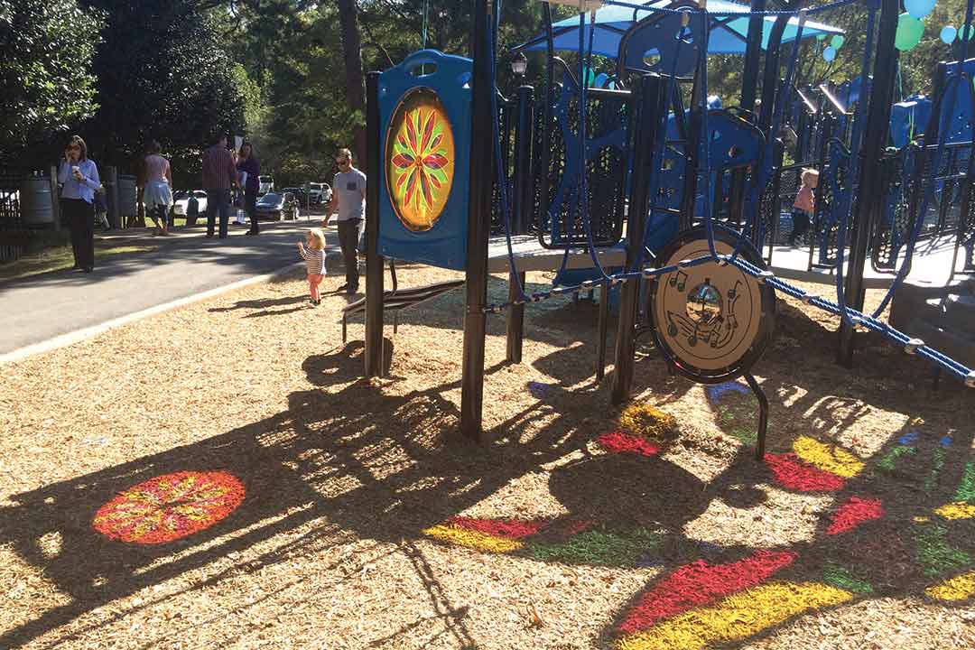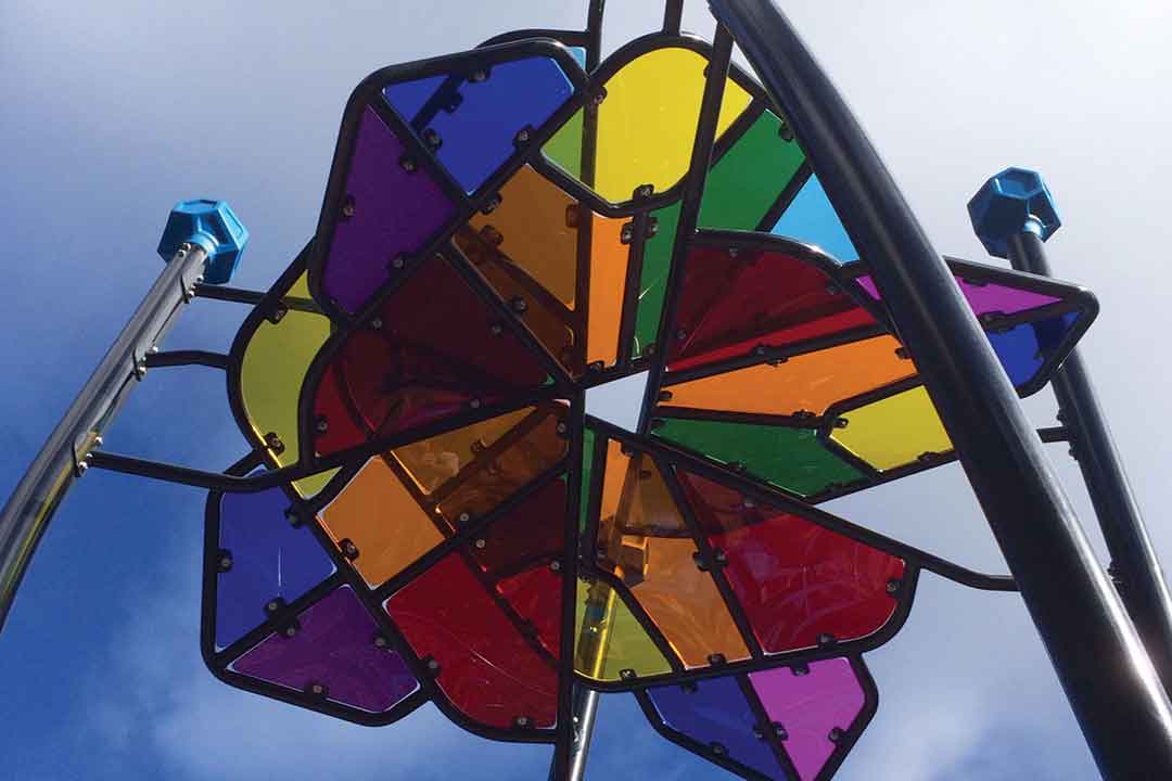 Other complementary elements, like transparent substrate pattern panels, created similar patterns on the ground that children controlled by spinning a dial in the center of the panel. This cause and effect element created a kaleidoscope of shifting color that delighted both the child who manipulated it, and those on the ground who could run around on the shifting pattern.