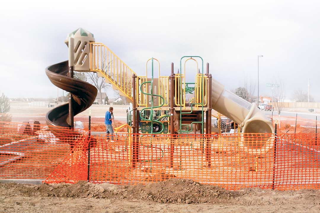 Sturdy fencing and written signage are necessary defenses to help keep children off a partially-constructed playground. Security guards may also be required to watch the area if children are present.