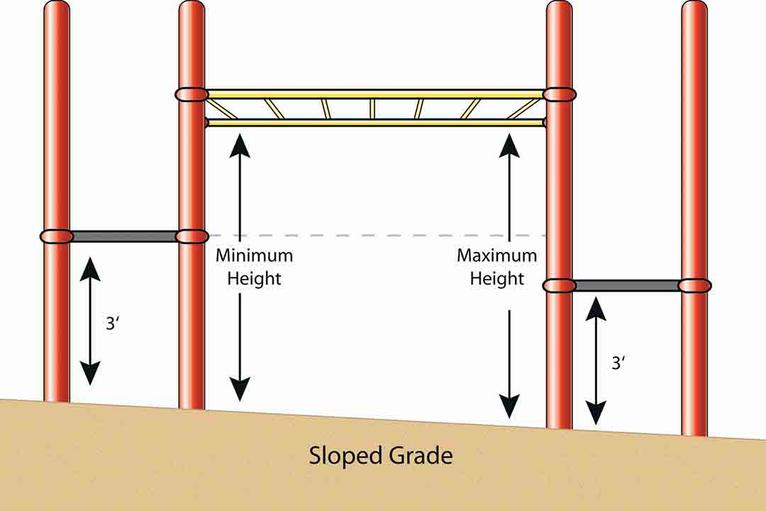 Adjusting your deck's heights in relationship to overhead events (see diagram) is another way to compensate for slope, as many overhead events have minimum and maximum height requirements which installers can use to make slope adjustments. Set your deck on the high side at about 3 feet, bring the overhead event to the lowest point recommended by the manufacturer, and move it over to the 3-foot deck at the low end of the play area. Then set the overhead event at the high point, which will also be recommended by the manufacturer. This is a way to compensate for up to 10 inches or more of slope.