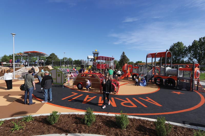DHM Design, a landscape architecture firm hired by the city, called for designs for the play equipment to be submitted. The theme for the new playground was proposed to highlight Cheyenne’s transportation history from covered wagon to rail to highway to aviation. Designs were submitted in March 2016 and the contract was awarded in April 2016 to Recreation Plus Ltd. The equipment was ordered from Little Tikes Commercial in October with several pieces of equipment custom-designed including the airplane, control tower, and covered wagon. A vintage car and trailer were ordered from Landscape Structures. Reiman Corp. was awarded the construction contract.