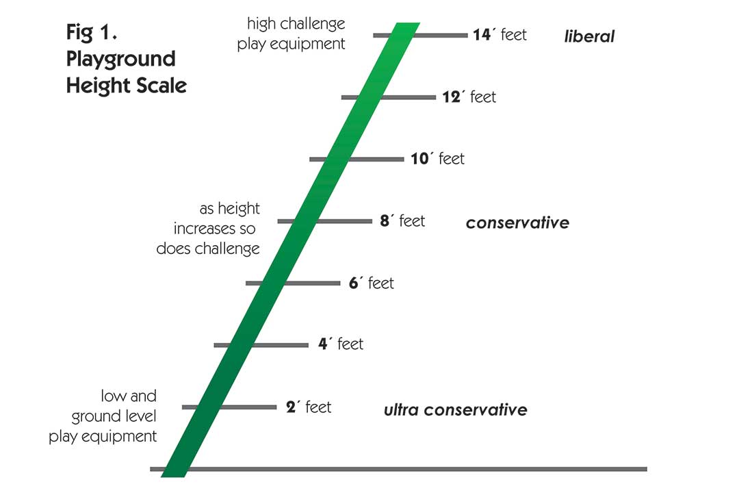 A good analogy for understanding the extremes of the playground height scale is politics. Some people are extreme right-wing conservatives–and others extreme left-wing liberals. Some playground safety advocates don’t want kids even to get off the ground. Others want them to hang from trees like chimpanzees. However extreme points of view are shortsighted and leave little or no room for collaboration or consideration for other perspectives. Therefore, playground purchasers and providers have to find a comfort zone somewhere in between these extremes. Fortunately, both sides of the playground height scale agree on this–equipment height should be limited to the capacity of the safety surfacing beneath to cushion a fall and lessen the likelihood of a life-threatening or debilitating injury. After all, no matter how high or how low you stand on the playground equipment height scale, we all have the same goal--to provide challenge, excitement, and fun and fit experience for children in a safe playground setting.