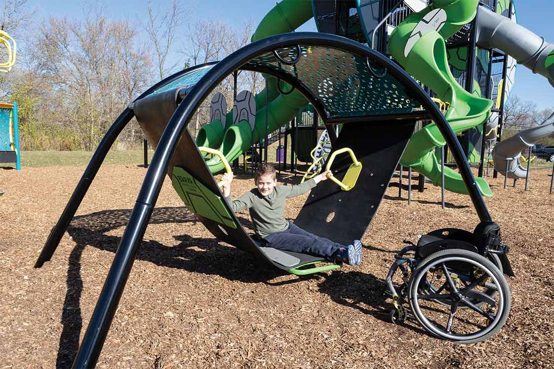 Everyone deserves access to play and recreation areas and those areas should provide experiences that are comfortable, developmentally-rich and full of play variety for children of all abilities. This means children can have the same play experience no matter their ability or preferences. Swinging is a great example of this. There are multi-user swings, traditional belt swings, the Freedom Swing designed for a more supportive swinging experience, the Konnection® Swing for a caregiver and child or two children and the Brava® Universal Swing that reimagines swinging for all. Designing a playspace that is inclusive of a variety of swinging options offers everyone equal opportunity to participate and gain the benefits of swinging.