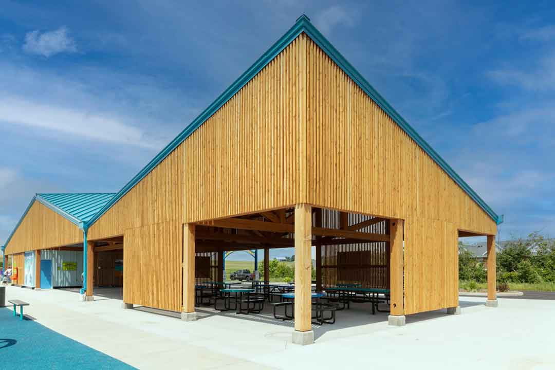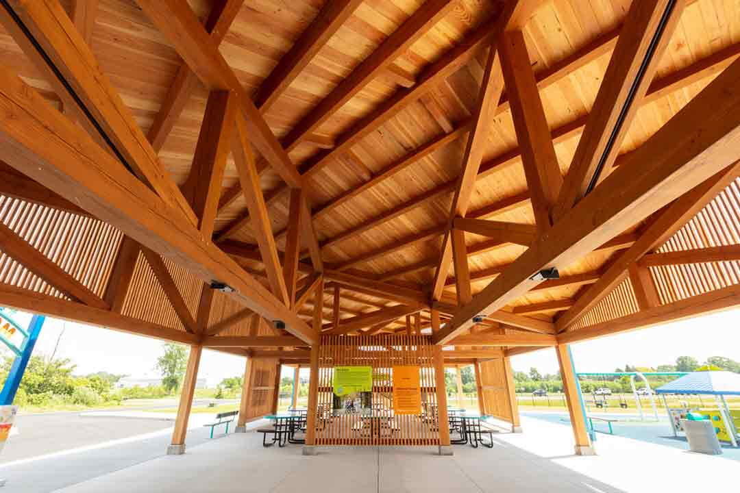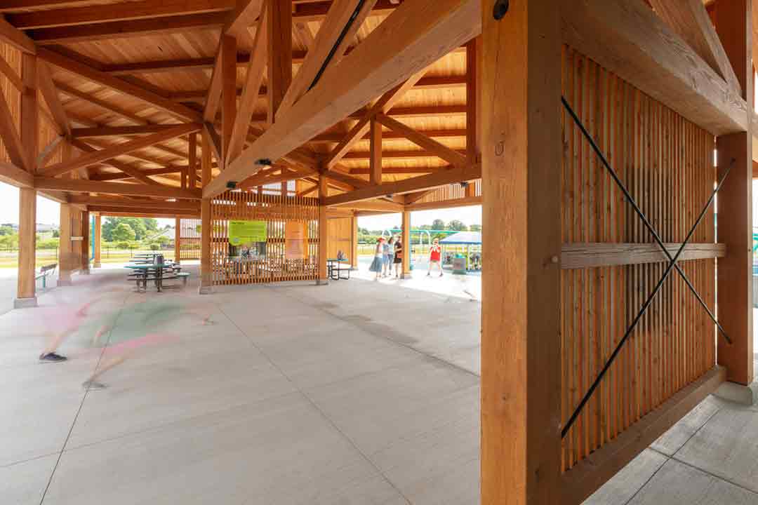The timber frame design serves multiple aesthetic and functional choices. It provides a sturdy and dependable support system for the building. It also allows the pavilion to breath, have open gathering spaces, and the wood elicits a calming feeling to the space while acting in gentle contrast to the bright vibe of the playground area.