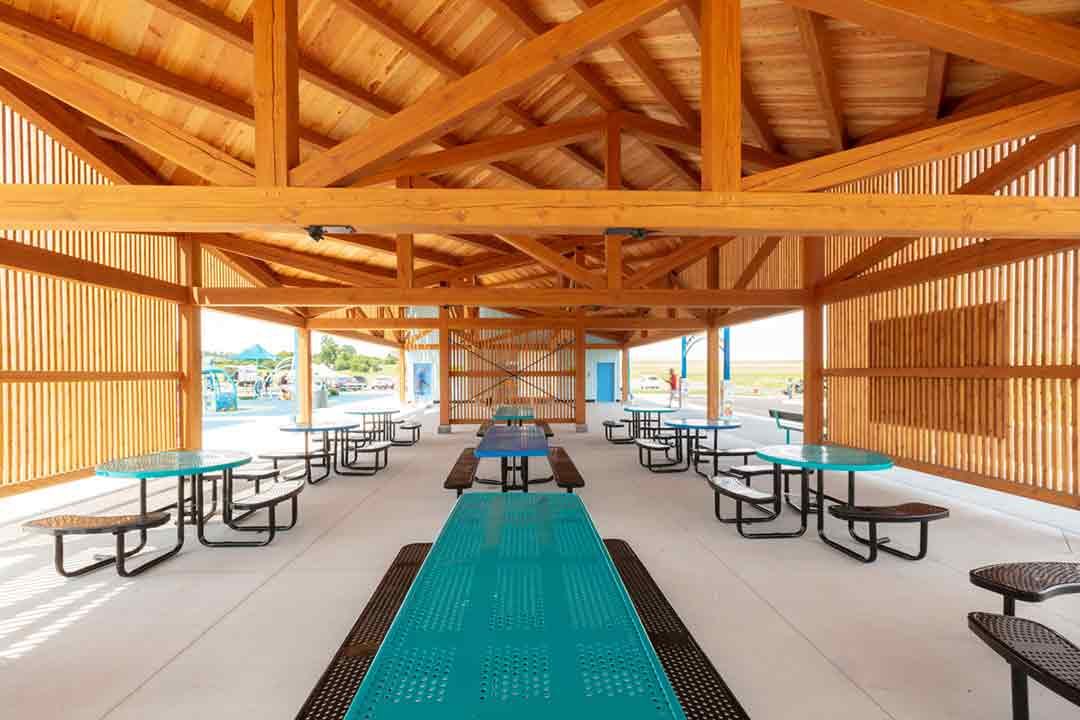 The pavilion’s design was multifaceted, balancing functionality and universal design aspects. “One of the things we wanted to do was make sure that the building would be a safe place, that there wouldn’t be hiding places,” said Kevin. “But we also wanted to have enough closure that it felt like you were in a picnic in the central area. So, we developed wood slats that the wind and light could come through but also provide some sense of closure.”