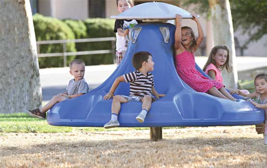 The vestibular sense provides spatial awareness though alerting and informing us about the direction, speed, and rhythm of the various types of motion we experience. This sense makes it possible for us to hold our heads and bodies up against the force of gravity, to keep our balance, to coordinate our eye muscles as our heads move, and to integrate the two sides of our bodies. The vestibular sense is the sense that drives our need to move throughout the day, whether we are young or old. Play equipment and activities that ask children to move in a rotary way, to balance, to spin, or to rock are ideal for supporting vestibular input. Movements that rely largely on the child for propulsion are also excellent. Any play that is bilateral, such as a climbing wall or jumping rope, also promotes this sense.
