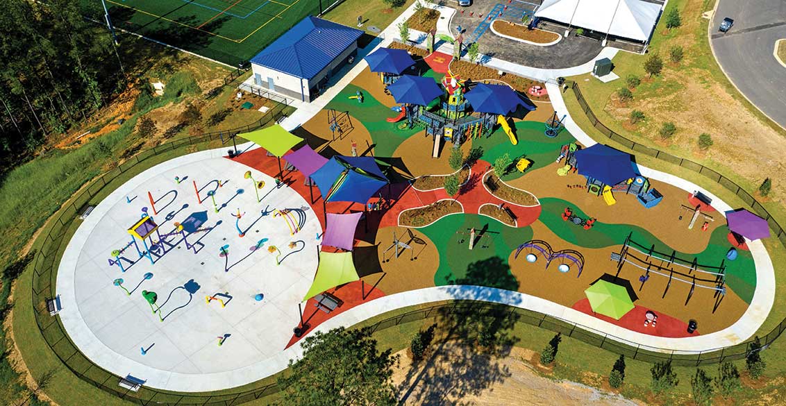 The city of Hoover chose GameTime, a PlayCore company specializing in inclusive play, to design and construct the new playground. Utilizing the research found in Me2®: 7 Principles of Inclusive Playground Design® developed by PlayCore and Utah State Center for Persons with Disabilities, GameTime and J.A. Dawson created a space that provides equal access, exciting play activities and opportunities for social interaction between children and families of all abilities. The purpose of unique inclusive play programs is to provide educational resources for communities that wish to move playgrounds beyond minimum accessibility to create more usable outdoor play environments that recognize everyone’s right to fully participate in equitable play. Inclusive play environments intentionally address the physical and social inclusion of people of all ages and abilities. The Seven Principles of Play include: