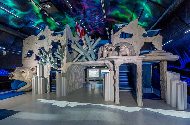 Located in Winnipeg, Manitoba is a polar bear playground residing at the Assiniboine Zoo that is a great example of interactive themed play. This playground is a fully immersive play area designed as an arctic wonderland of active participation intended to educate and entertain visitors about the great polar bears of Churchill. Features include sliding and climbing as well as an ice cave with hidden messages, a moving ice-mass floor that responds to footsteps, a responsive Aurora Borealis wall where children can conduct the northern lights, and a wall-sized icicle xylophone!