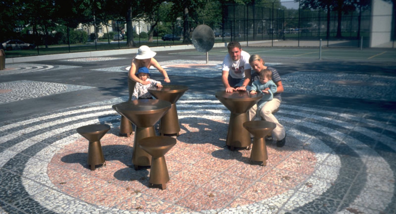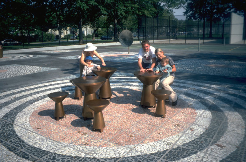 Sound Garden at P.S. 23 was created for use during recess and includes bronze table/sculptures, modeled after Chinese and Burmese frog drums, and stools created with a North African Islamic drum in mind. These provide seating in addition to being a great instrumental ensemble. Close by you’ll find a sculpted concrete bench embedded with various sizes of pipes, pipes which tap into a hollow space within the structure. Children are able to whisper messages to each other through these.