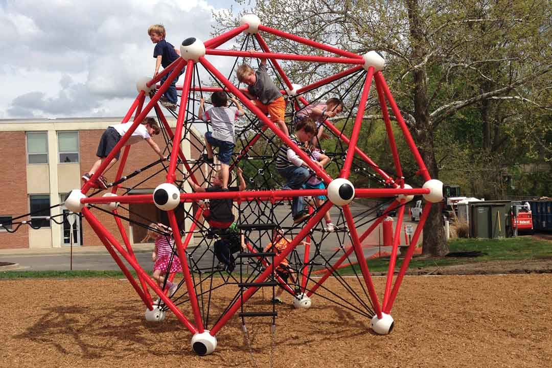 Traditional play equipment tends to be wide-spread and closer to the ground. It separates children in their play behavior; for instance, one child may be using a slide while another is using a climbing component. The 3-dimensional net structures offer a more compact design without these same barriers separating the children. As they play, children can get close to each other allowing for social interaction and communication. Even if a child stops playing while on the structure, he or she can still sit and talk to the others on the structure.