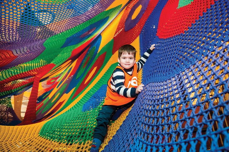 That's why Yeti has an obstacle course, vertical labyrinth with complex transactions and multistory crocheted labyrinth. A giant four-level structure is one of the main attractions in Yeti. It was handmade by 42 craftsmen. In took 572 kilometers of rope to create this labyrinth. From outside it looks light and airy, but in reality, it can withstand up to 11 tons per square meter. You can climb, jump, roll down and even run on it. It's not just a simple game element, but a real simulator for all the muscles.