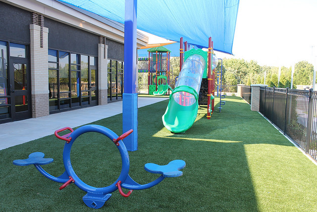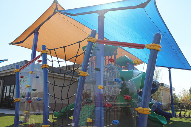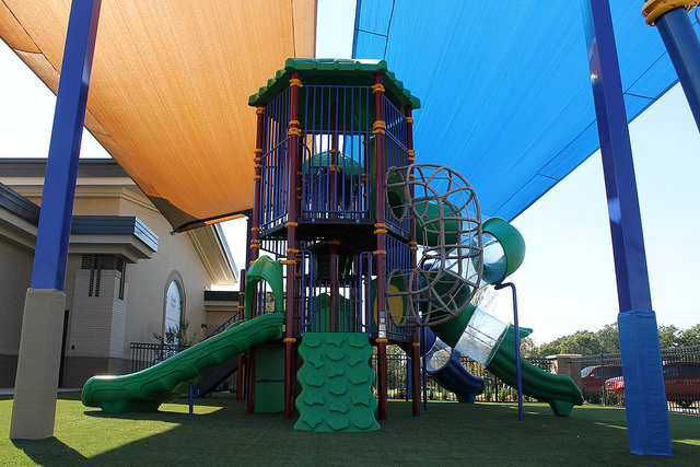Along with the three structures to accommodate children of all ages, the church purchased Xccent’s Monarch Climber and the Periwinkle Rocker for the 2-5 and 5-12 age playground areas. The church topped off the entire outdoor playground site with thick, 2 1/8” padded, green Thatch Turf surfacing, and four custom sail shades in sandstone and blue, which will help shade all of the playgrounds during hot summer, Oklahoma days.