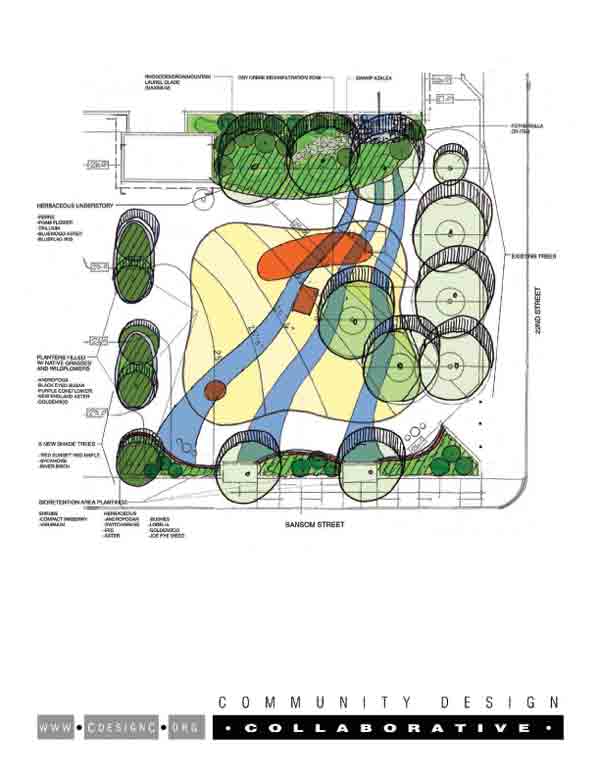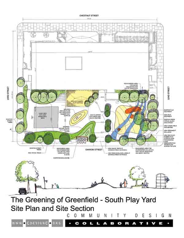 The report, titled “The Greening of Greenfield School,” Campus Parks Initiative Conceptual Master Plan for Sustainable Outdoor Space, details the project. This community-building process report identifies five phases of the construction process—phases that can be completed in any order or even concurrently—as well as timing and budget models. The space was designed to be an outdoor laboratory where children can learn about micro-climates, indigenous plants, rainwater absorption, energy conservation, harvesting, and their symbiotic relationship to the environment. Another great thing is that they also have manufactured structures incorporated into the design. This particular project will improve the environmental sustainability of the south play yard and improve the “Secret Garden,” which is a walled garden. A green roof will also be installed on the school building as well as photovoltaic panels on the roof.