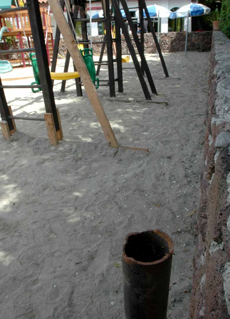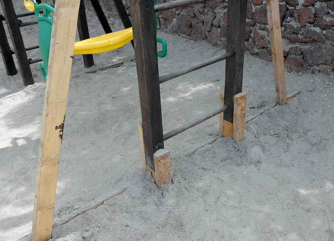 Hazards aren’t always an immediate part of the play structure. Learn to look beyond the structure to what hazards lurk within striking distance. Sometimes those hazards can be the containment walls or borders themselves. Sometimes they are a little more flagrant such as the rusty pole pictured in the third thumbnail.
