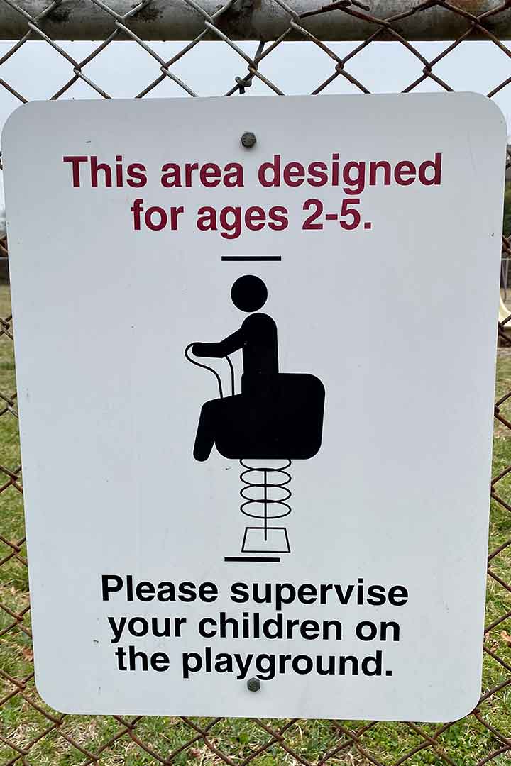 Place the rest of the signs/labels so they are readily visible and alert the viewer in time to act. They can be on the equipment or be freestanding (i.e., mounted to a stand-alone post, but outside of use zones). If you have a fenced-in playground, put them at the gate, unless you have equipment that allows differing age ranges. In that case, it should be on the individual pieces (not each “component,” but one on the tot swing, one on the 5-12 composite structure, etc.).