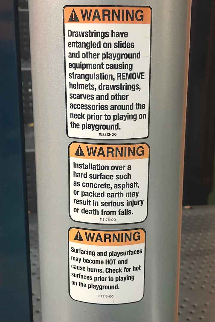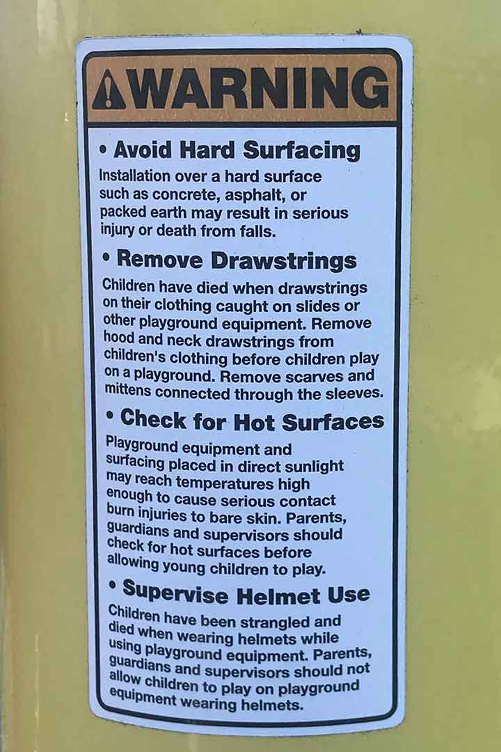 There’s literally a multitude of playground cases that have claimed failure to warn that surfacing was required. Claims are made, and oftentimes won, that, had that proper sign or label been installed and in view, the maintenance workers would have been reminded to replenish the loose fill surfacing or patch the poured rubber surfacing, averting an injury. I think there’s some justification to that, but only to a point.