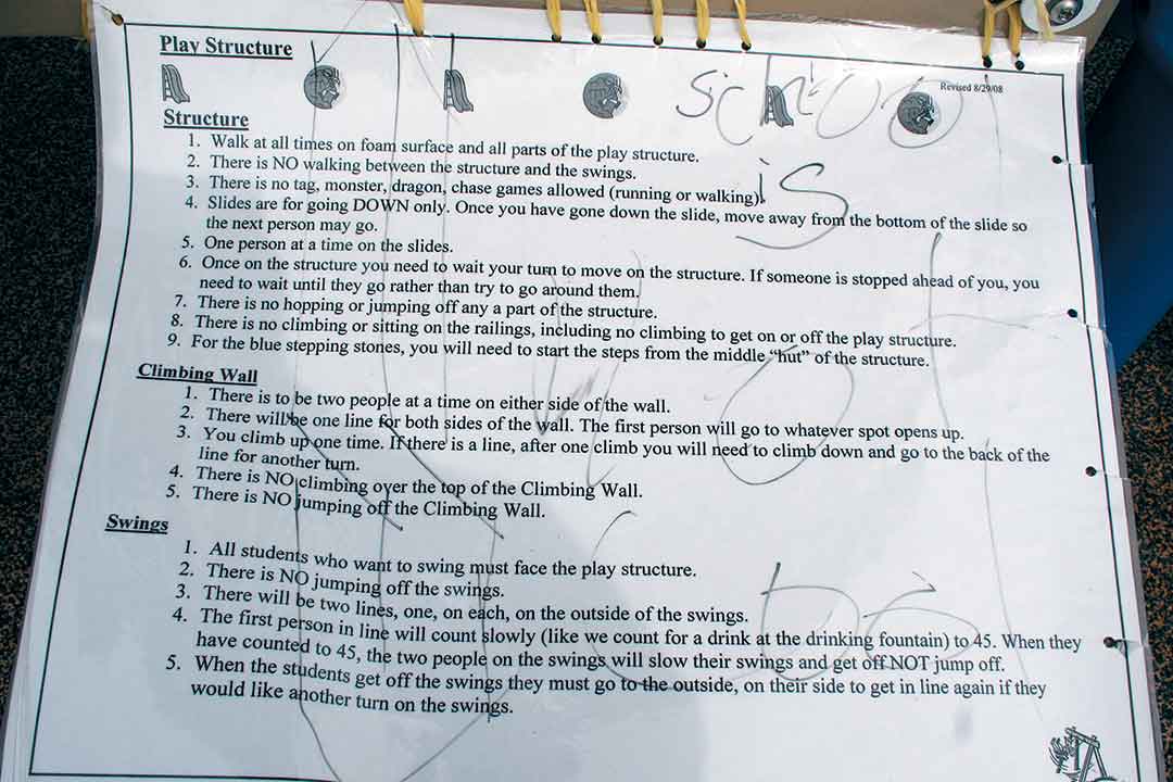 I visited a school a couple of weeks ago that really got my attention. There was a large sign at each end of the play area with no less than 19 rules: nine for the structure, five for the swing and five for a climbing wall. I won’t give all of the rules but what impressed me the most were the rules for swing use.