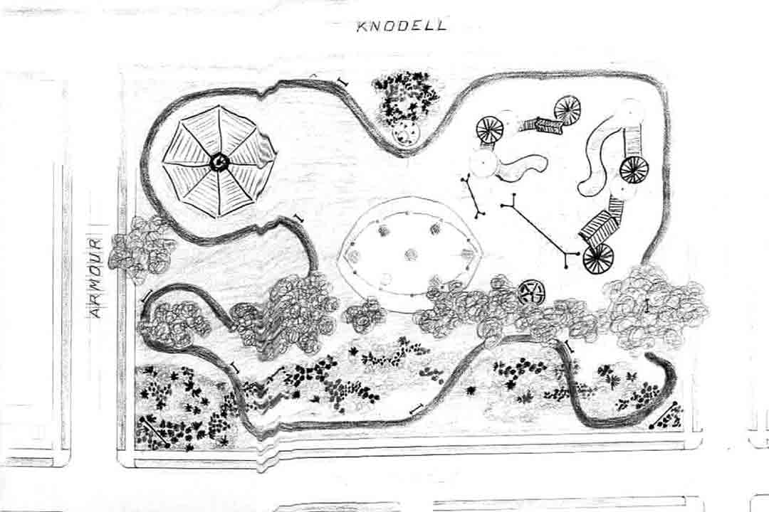 They also developed, with the City Airport Renaissance Association (CARA), a plan to save a neighborhood park that the city planned to “sell” as “surplus” land and revitalize it with new play equipment if funding can be secured. Due to the strength and commitment of the CARA group, it was decided early in the planning process that the newly revitalized “Armour Knodell” park would be inter-generational in its scope, so residents of all ages would be able to interact with each other’s company. In its vision meetings, one of the CARA residents compiled the drawing above to capture the essence of the revitalized park, complete, with a “splash pool,” walking path, a butterfly garden, seating benches, and a place reserved for chess players.