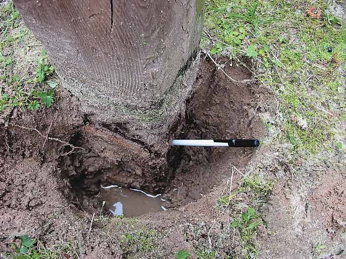 Look for persistent dampness in the wood and all materials touching the wood, especially organic debris. Check each wooden post to a depth of 18 inches and at the union of any wood and concrete. It is important to remember that one decay-producing fungi can grow into wood a considerable distance from the source of water. The fungi’s microscopic strands of hyphae threading through the wood serve as siphon-like straws that draw the moisture out of the ground and into the center of apparently dry wood. This is one type of “dry rot,” an inaccurate term because truly dry wood will not rot.