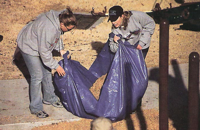 Removal of objects such as glass, trash, leaves, and other debris is a simple, cost-effective way to keep your wood surfacing performing and looking good. This measure should be incorporated into routine playground inspections. It makes your play area inviting and minimizes the chances of more trash being left behind. Make sure a trash receptacle is nearby.