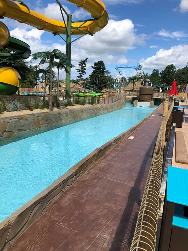 The 2018 addition Harrington Bomanite completed for Canobie Lake Park was Tidal River, a 45,000-SF lazy river with waves, circling the park’s grandest water feature, Castaway Island. Only one of three tidal rivers ever created, after entering a zero-entry wave pool guests loop around the tranquil island oasis propelled by waves that form every ten seconds. In addition to the river, the expansion included adding a new kiddie pool and significantly enlarging the pool deck facing Castaway Island.