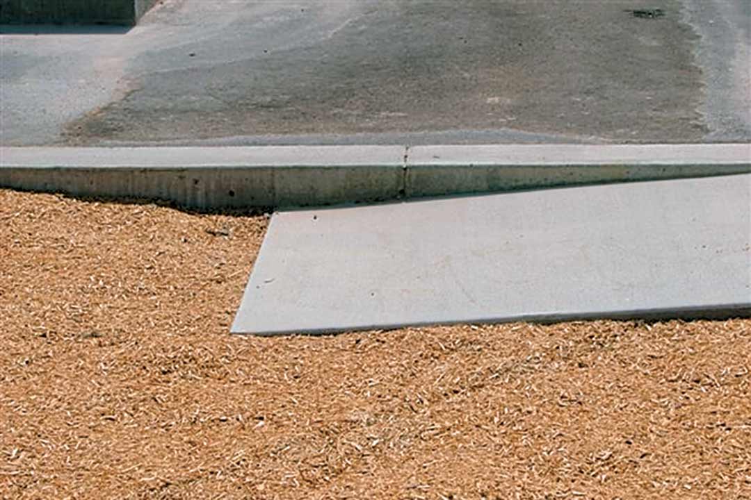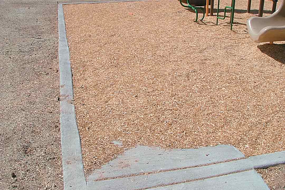 Most loose-fill products compact, move, blow away, or get pushed away from the top edge of the border or sidewalk. This creates a lip or edge between the top of the accessible surface and the sidewalk or entryway. It is therefore required that a ramp be available to accommodate the wheelchair with accessing the surfacing to meet the requirements for compliance.