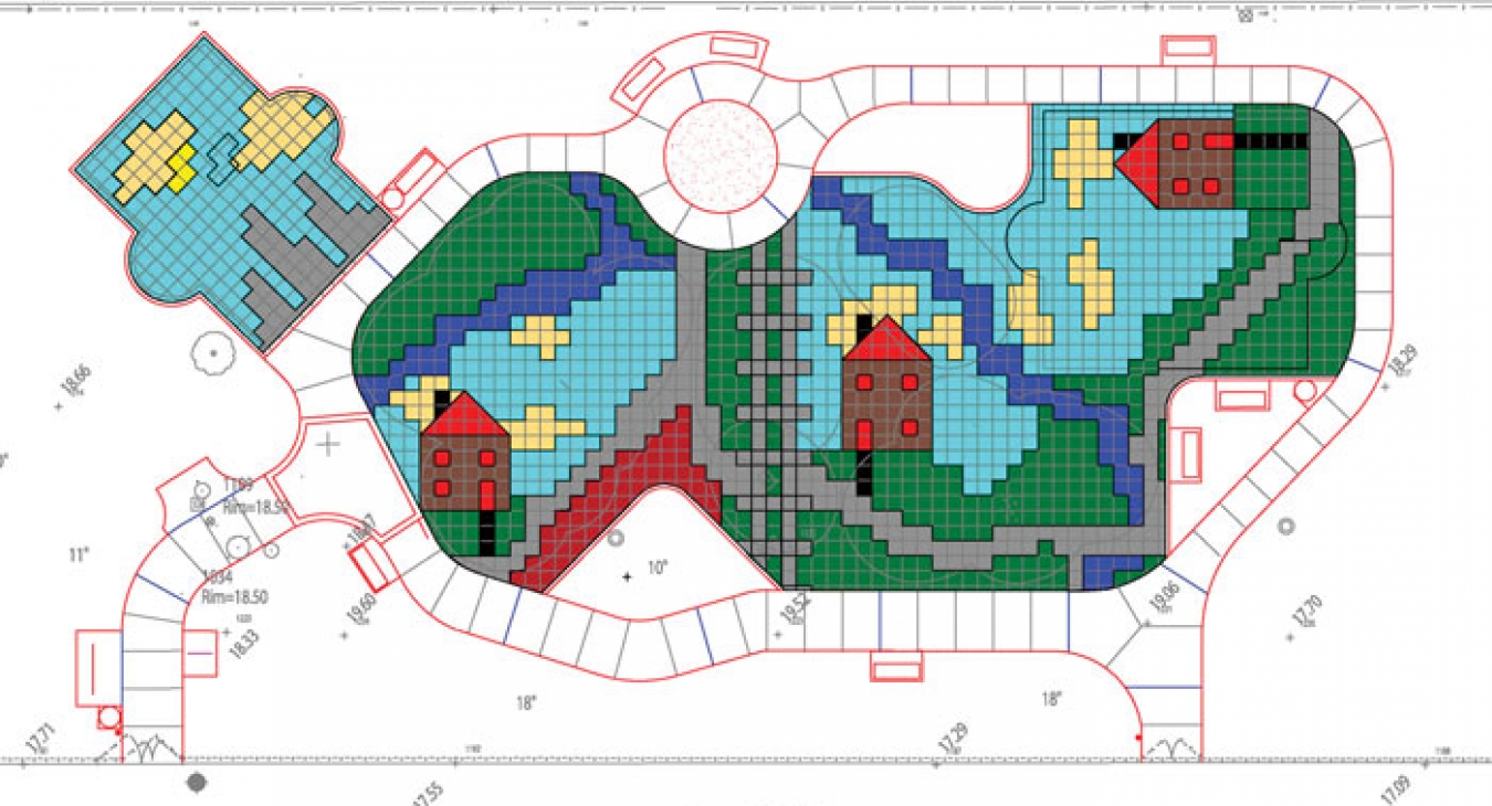 The fourth and lowest cost option involves using various colors of tiles in order to build patterns into the surface. This method limits your ability to create the freeform flowing type of designs that can be created with coating or poured-in-place, but it is surprising what can be achieved with a little creativity. Designs can be as simple as a checkerboard pattern or as complex as the enclosed design that involves the depiction of houses, skyscrapers, railroad tracks etc. Since incorporating different colors of tiles into a surface requires no additional labor or materials, there are typically no additional costs associated with this option. In fact, incorporating the use of less expensive color options into the surface to create the desired effect will reduce costs. This method is quickly becoming the option of choice for its ability to offer simple and cost-saving aesthetic appeal. Like poured in place, the color is typically a full 1/2 inch depth which also provides a permanent maintenance-free aspect to the design.