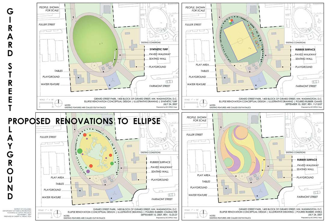 “Shortly after I joined the DPR, then-DPR director Wanda Durden asked that the Office of Planning and Capital Projects (OPCP) take a look at options for providing a safe, stable, sustainable play surface,” Frear said. She said the Girard Street Park area was being referred to as “The Dust Bowl” but Frear took to calling it “The Ellipse,” because “that sounded more hopeful.”