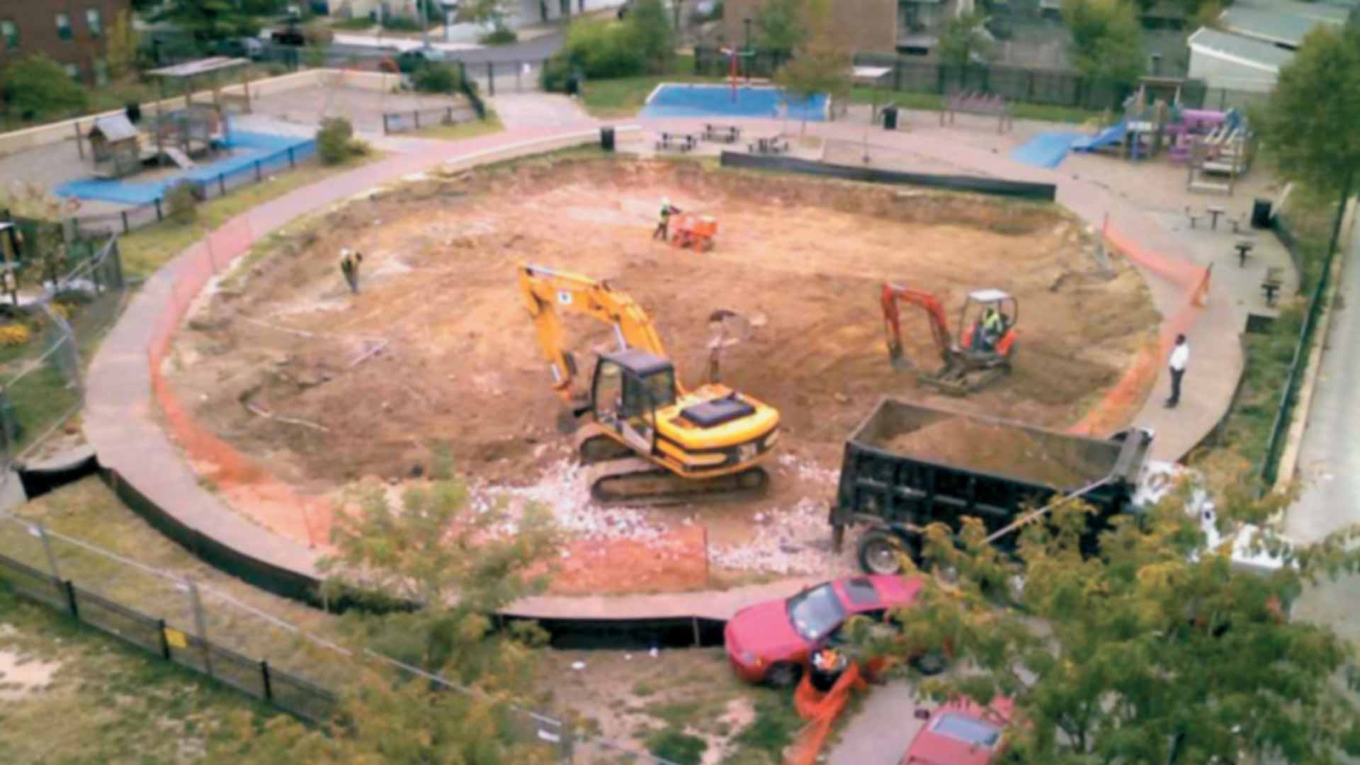At that point, other agencies had to be brought into the picture to make sure nothing of historical significance was demolished or damaged during the installation of the new Girard Street Park Playground. Frear explained, “So we coordinated with the D.C. Historic Preservation Office (D.C. HPO), which advised that this neighborhood was once part of Columbian College, which eventually moved to Foggy Bottom and became George Washington University. Also, during the Civil War, a huge hospital was located in this area, and that it was likely the remains of these and/or associated structures that we had uncovered. But D.C. HPO also advised that the city had already done a preliminary survey of the area and that assorted remains were not considered significant enough to preserve. So, construction resumed and upon the advice of the rubber surface contractor—Surface America—we excavated to 36 inches and backfilled with clean fill and gravel, to ensure a proper base for the final surface.”