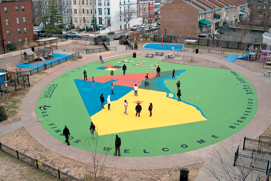 The Girard Street Park and playground is definitely an urban park and its redesign was meant to capture the cultural diversity of the neighborhood that surrounds it. “Girard Street Park Playground is located in the neighborhood of Columbia Heights, a culturally diverse, redeveloping area of the city,” Sherry A. Frear said. Frear, as a member of the Office of Planning and Capital Projects in the Washington, D.C. Department of Parks and Recreation, was instrumental in seeing the new Girard Street Park come to fruition. In an effort to capture that neighborhood’s culture and diversity in a unique way, Frear explained what the city incorporated in the design.
