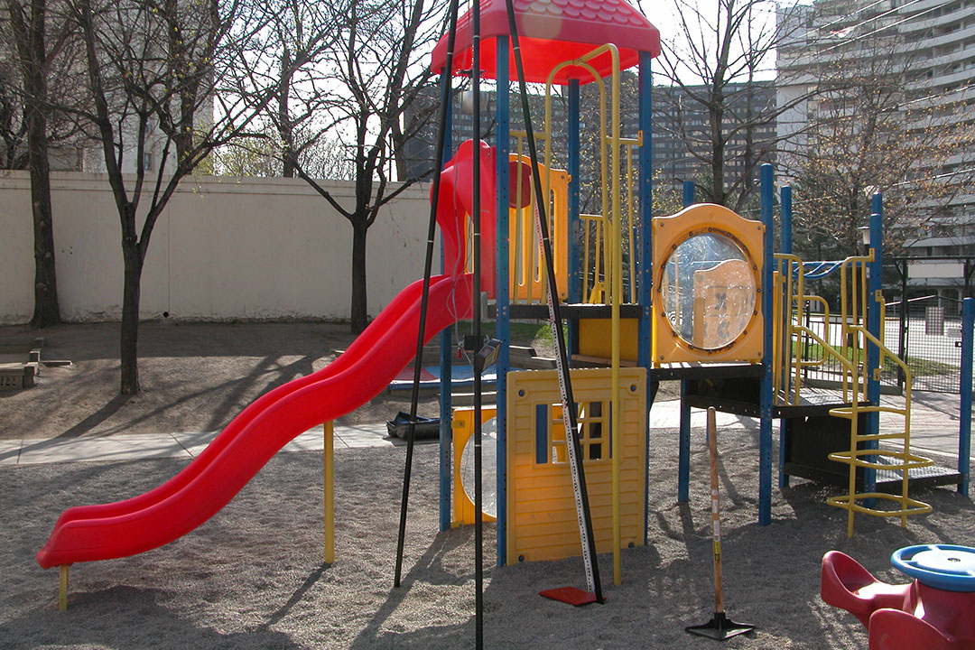 High Traffic Areas—Exits of slides, tunnels, climbers, under swings, and routes of travel will need beefed up or maintained with an organized maintenance program. These areas lose their shock-absorbing properties when the material wears out or gets displaced.