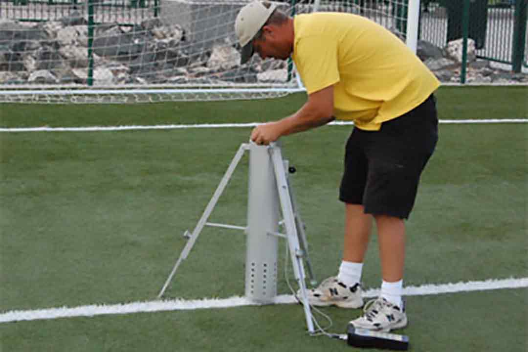The next question is which ASTM relates to playing fields. The ASTM F1936 Standard Specification for Impact Attenuation of Turf Playing Systems as Measured in the Field states: The impact attenuation of turf playing systems can be measured in a laboratory, but such tests are often conducted under optimal or tightly controlled conditions. To accurately assess the impact attenuation an athlete will encounter on an installed field, that specific field must be tested in situ. That objective was the impetus for the development of this specification. Initially, the stated scope of the specification was limited to measuring the impact attenuation of North American football fields. The scope of the current revision encompasses a broader range of sport-specific field configurations and a protocol for conducting tests on multi-sport fields. ASTM International defines the equipment as: The impacting missile shall be cylindrical with a circular, flat, metal, impacting surface. It shall weigh 20 lb (9.1 kg), and have a 20 in. (129 cm) surface face with the impacting edges slightly beveled to eliminate sharp edges. The “A” Missile is the equipment to test the turf playing field.